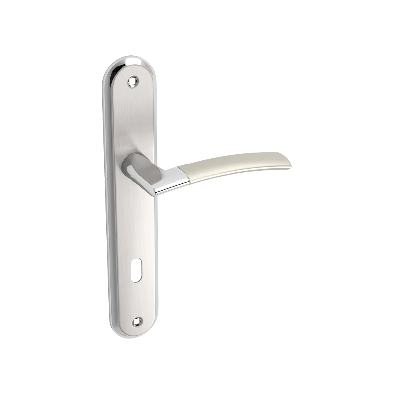 LUXOR klamka na szyldzie długim na klucz sprawdzi się w nowoczesnych i klasycznych aranżacjach, gdzie ważna jest trwałość, komfort chwytu oraz spójność z wyglądem skrzydła drzwiowego i okuć.