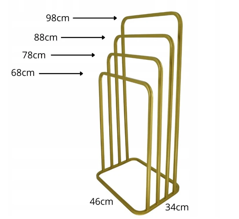 Nowoczesny Stojak Wieszak na Ręczniki 4 Ramienny Zaokrąglony Metal Loft ZŁOTY 021 W - 16 - 4W - 98Z ZŁOTY sprawdzi się w przedpokoju, garderobie, biurze lub poczekalni. Ułatwia organizację i pozwala utrzymać porządek tam, gdzie liczy się szybki dostęp do okryć wierzchnich.