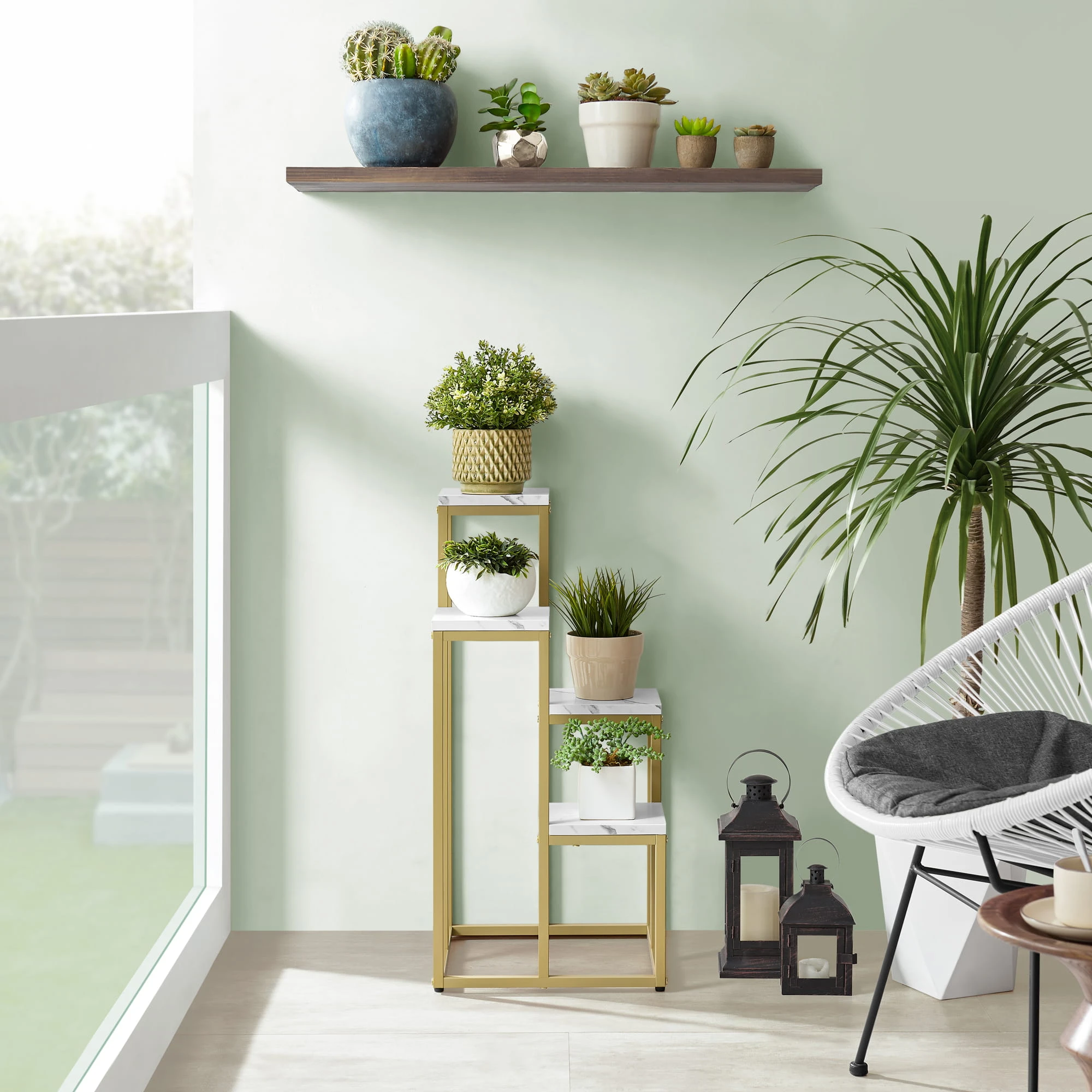 Regał kwietnik 4 półki - marmur nogi złote sprawdzi się w salonie, sypialni, biurze lub przedpokoju. To praktyczny mebel, który ułatwia organizację i jednocześnie buduje charakter wnętrza.