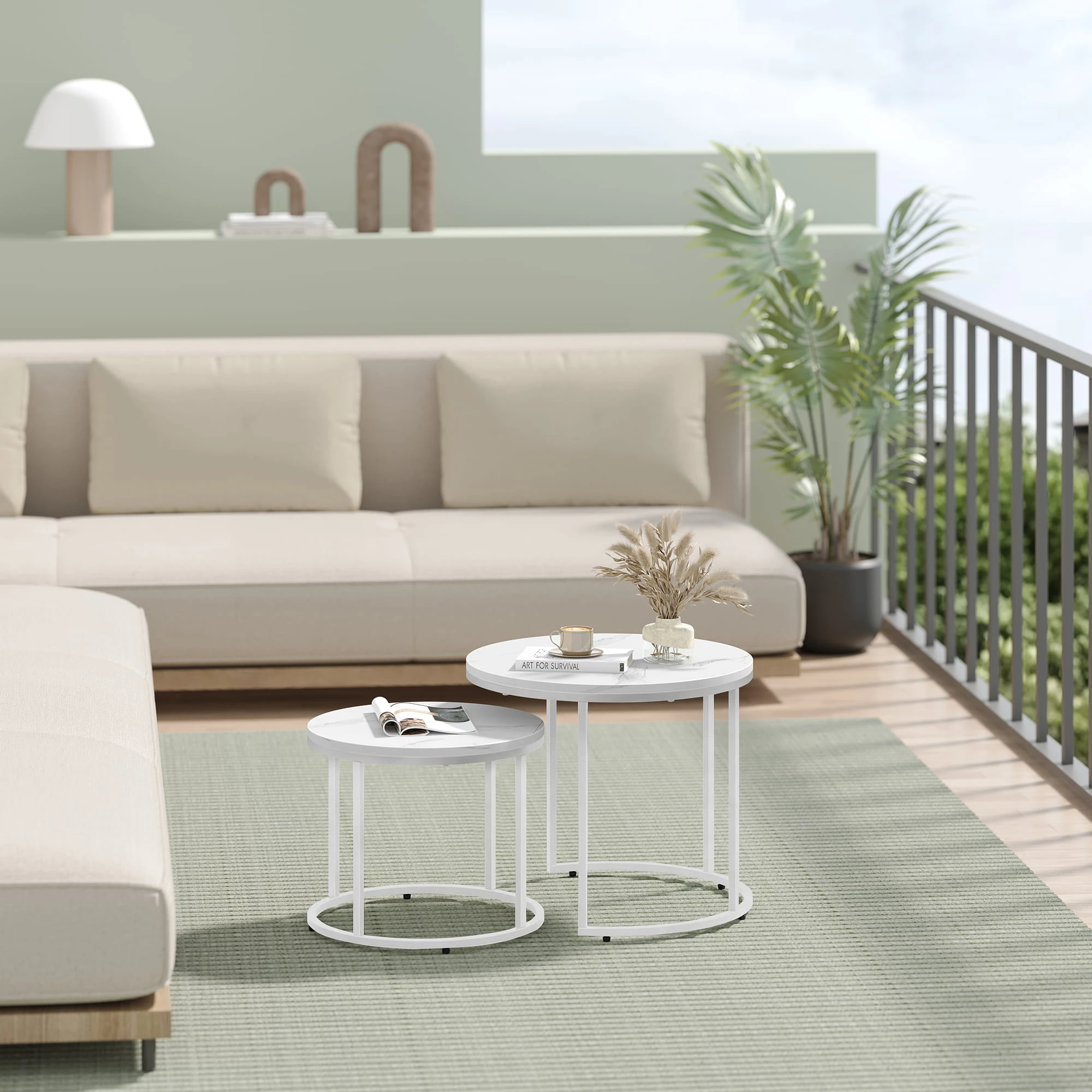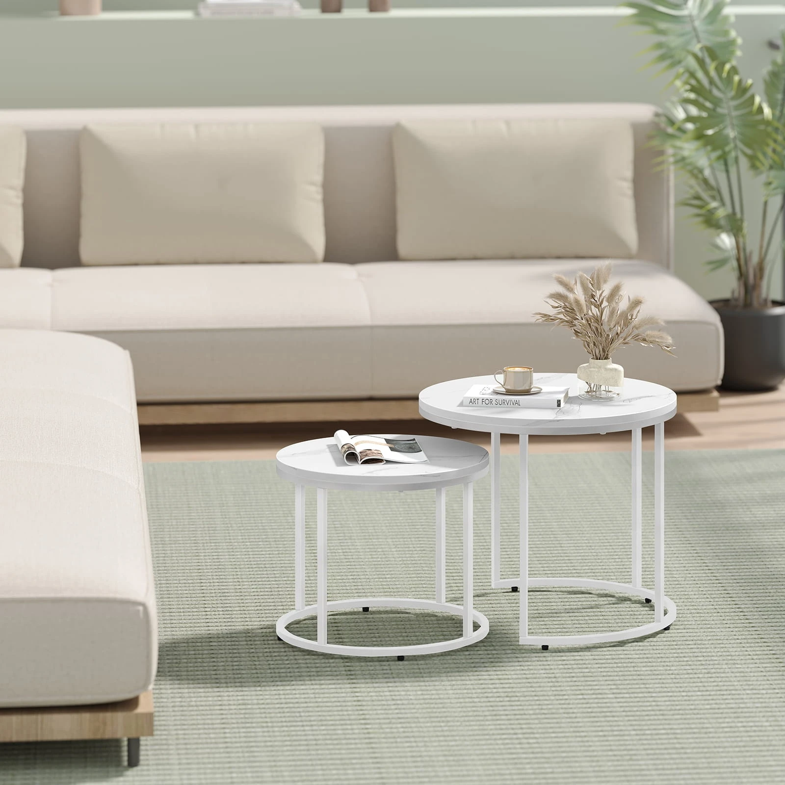 Stolik kawowy okrągły 2szt - marmur nogi białe sprawdzi się jako stolik kawowy, pomocniczy lub dekoracyjny. To mebel, który łączy lekką formę z codzienną funkcjonalnością.