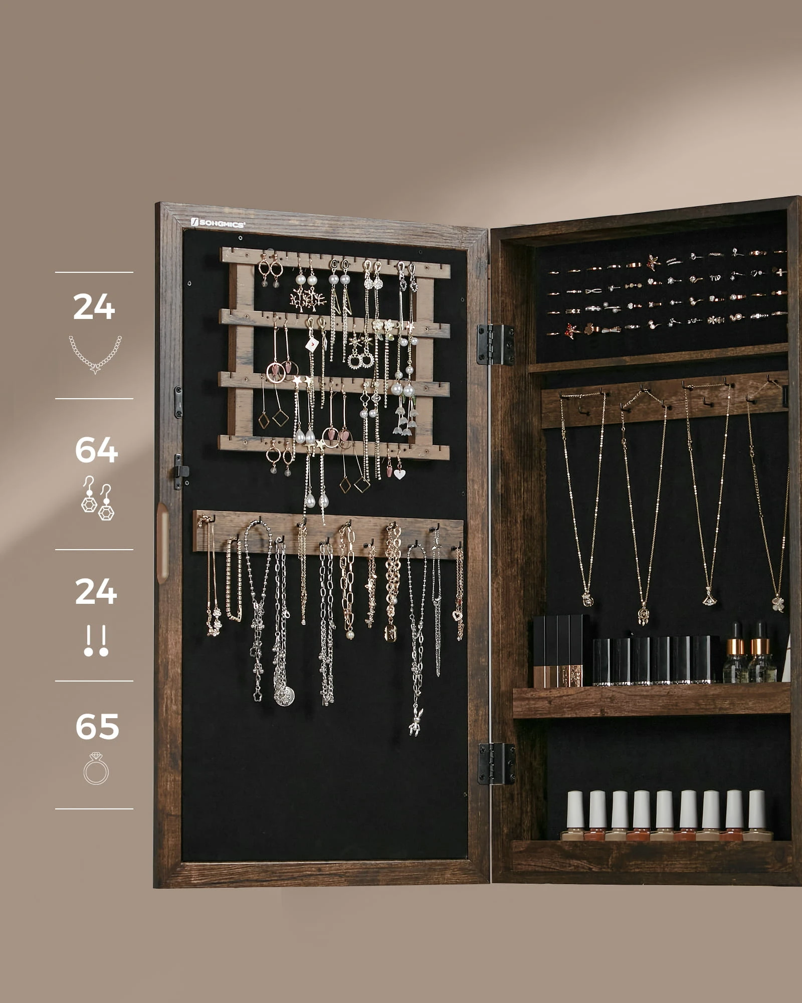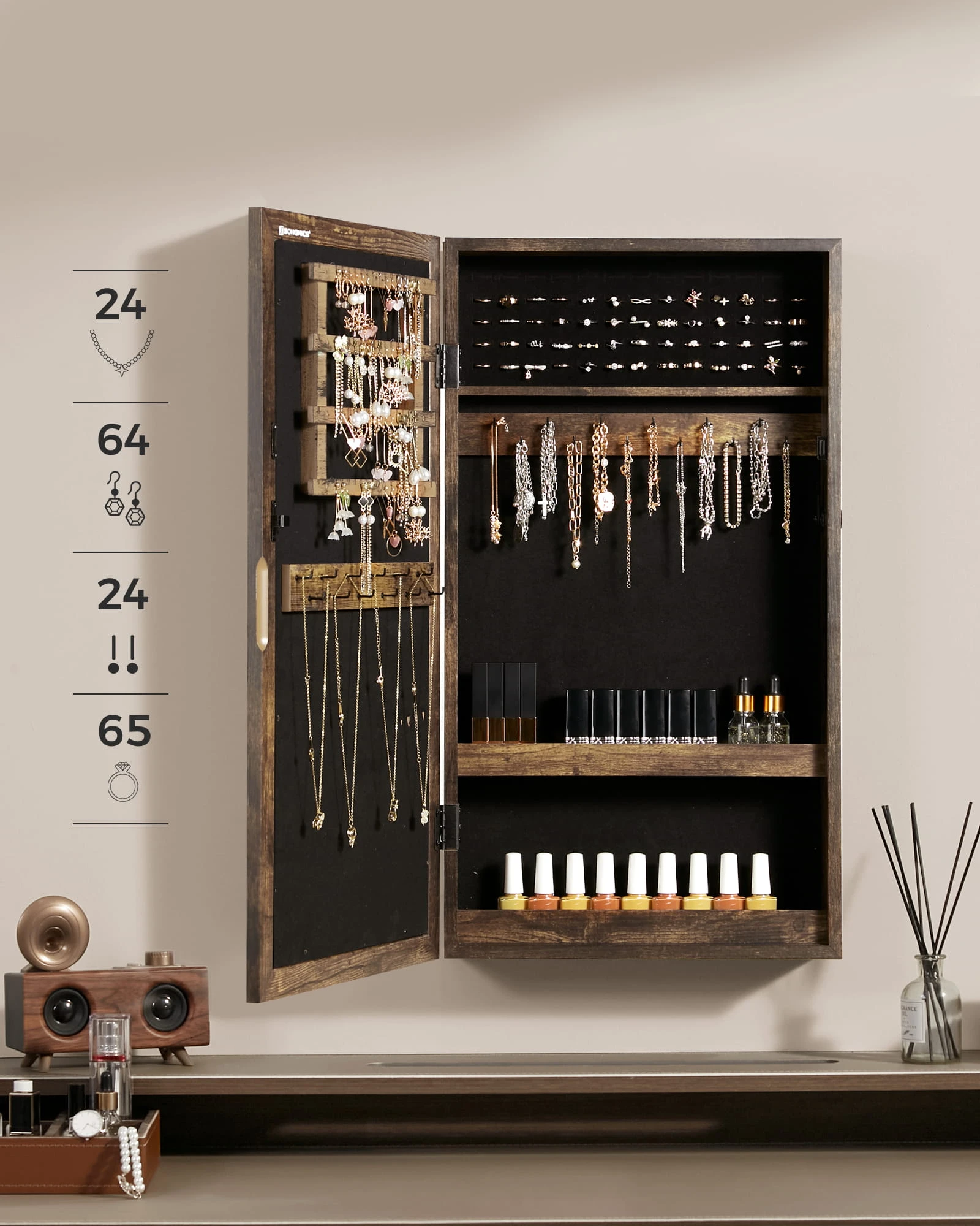 Szafka z lustrem na biżuterię - JJC051K01 sprawdzi się tam, gdzie liczy się wygoda organizacji oraz spójny wygląd wyposażenia. To rozwiązanie do nowoczesnych wnętrz, w których ważny jest porządek i funkcjonalność.