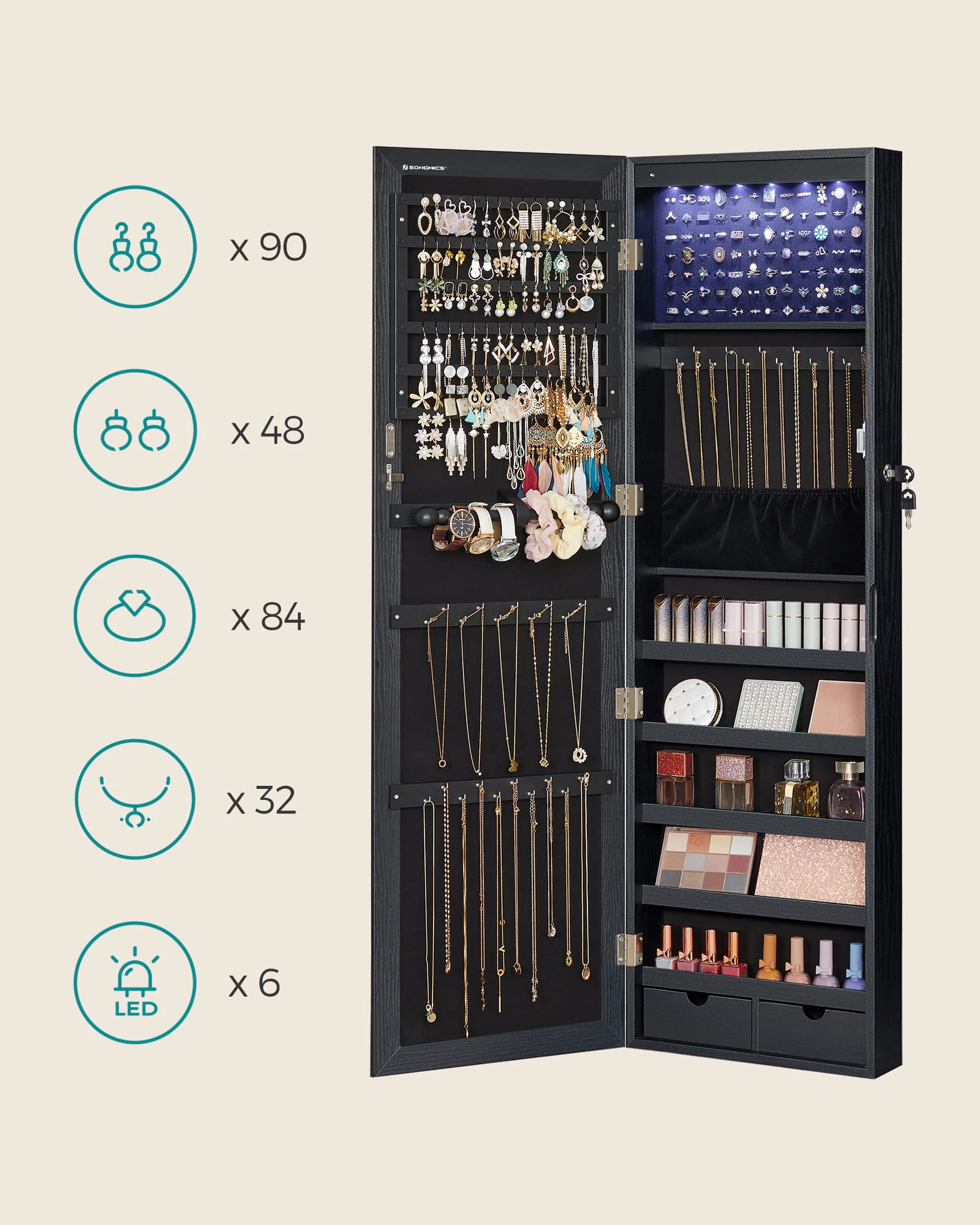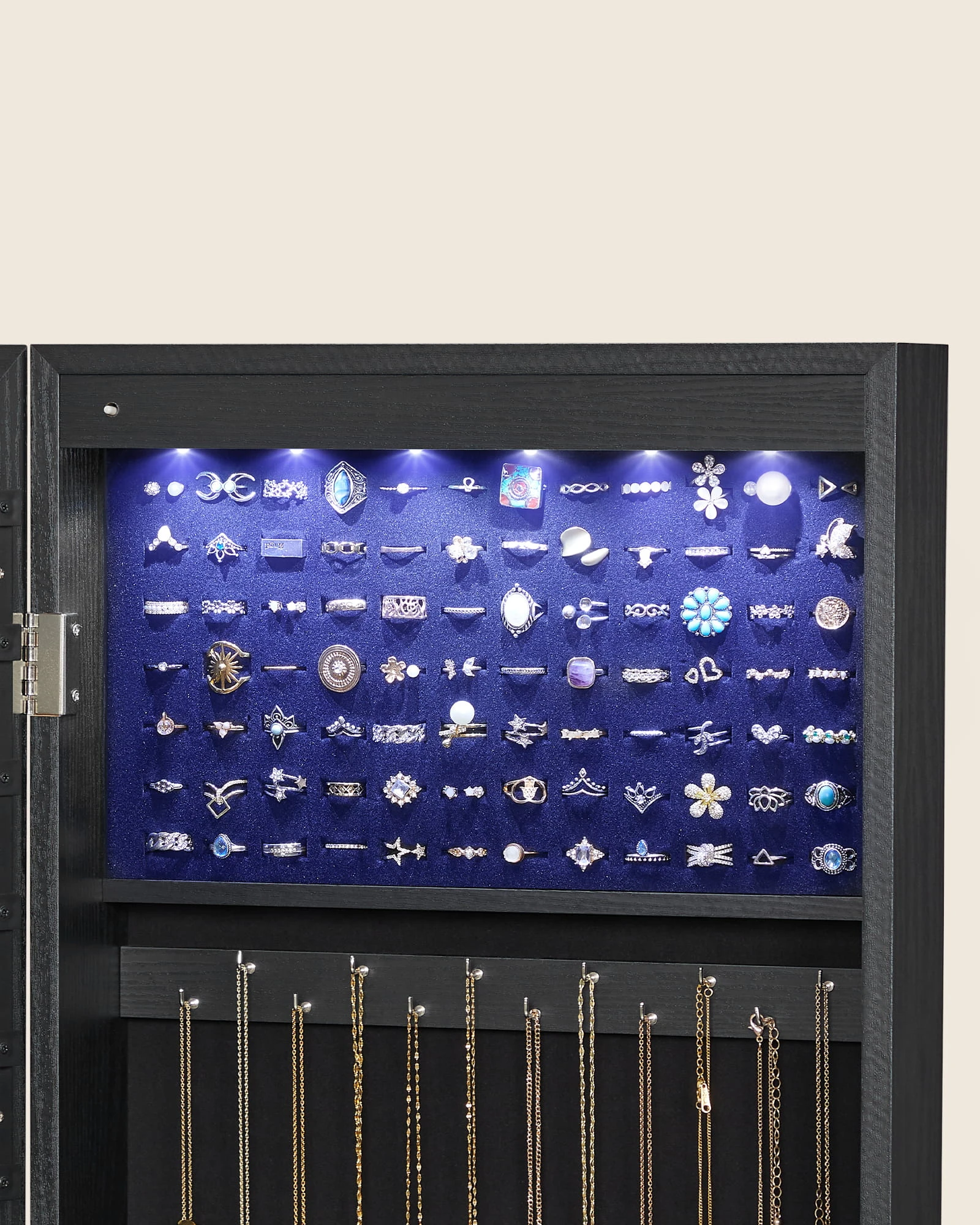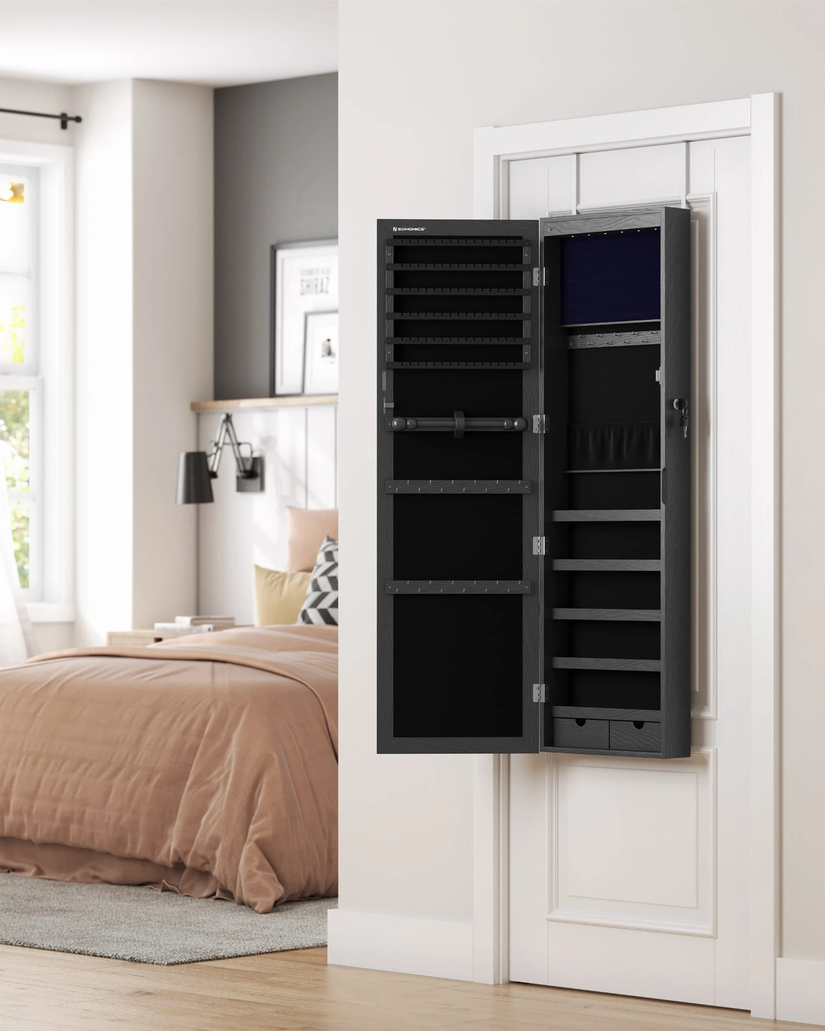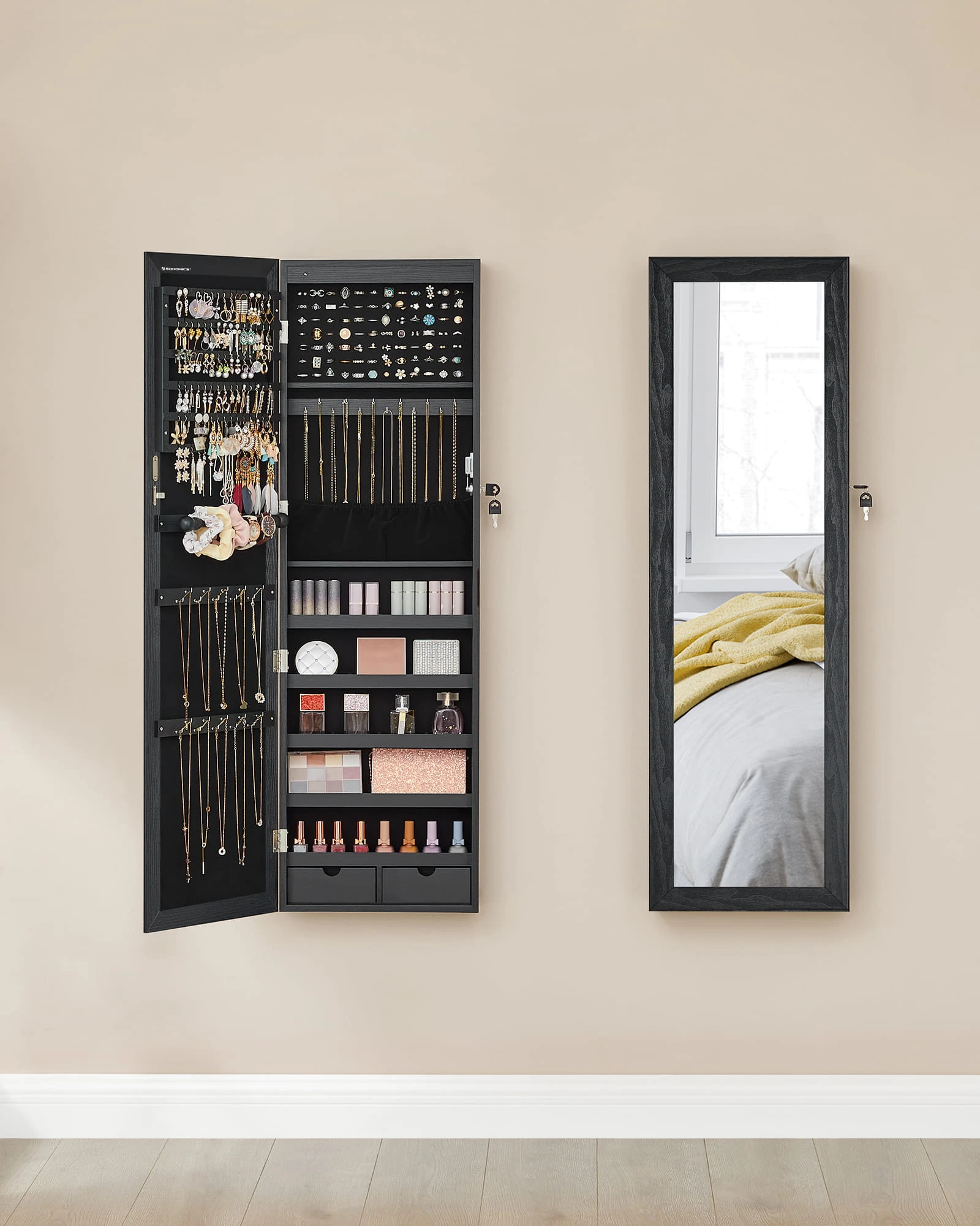 Szafka z lustrem na biżuterię - JJC093B01 sprawdzi się tam, gdzie liczy się wygoda organizacji oraz spójny wygląd wyposażenia. To rozwiązanie do nowoczesnych wnętrz, w których ważny jest porządek i funkcjonalność.