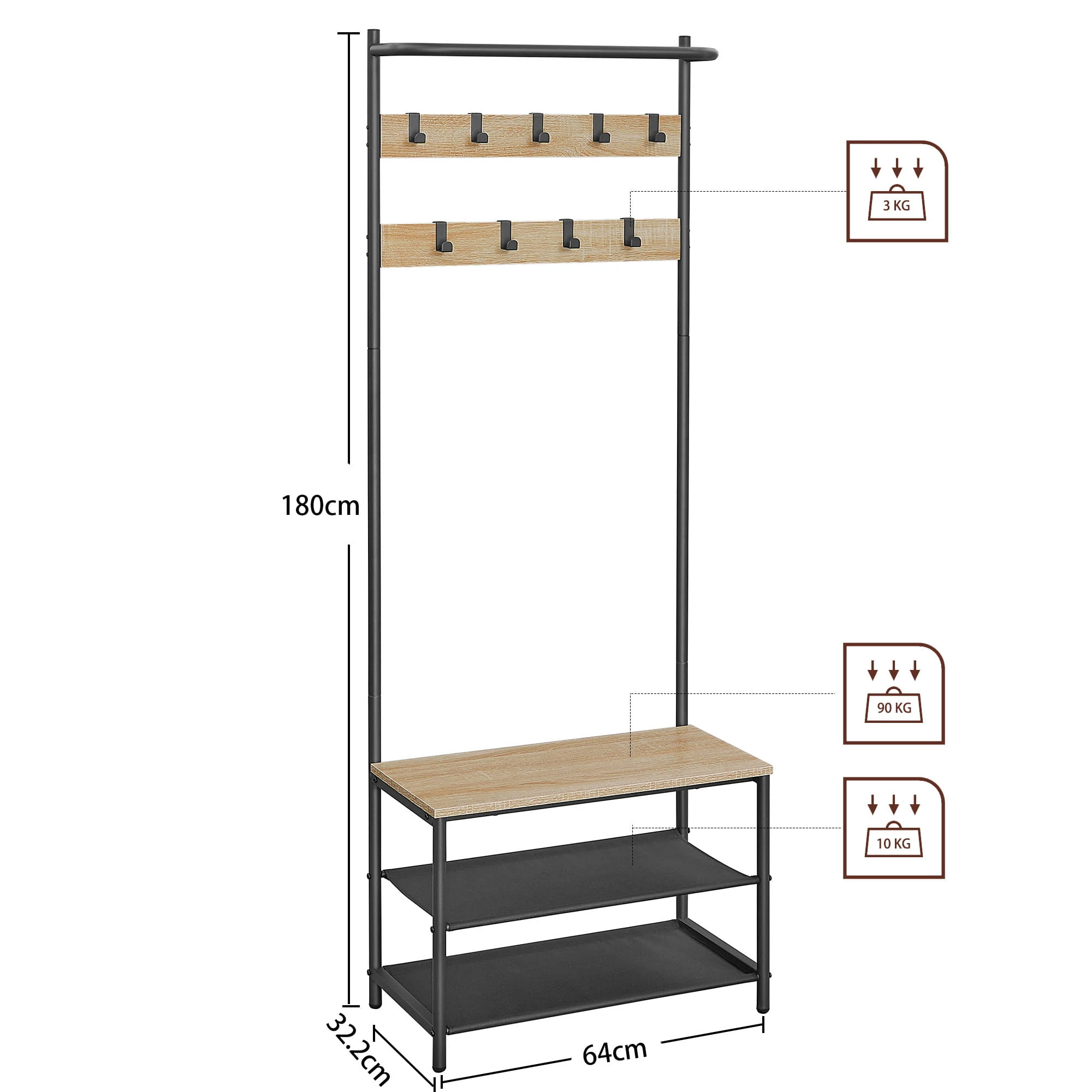 Wieszak Stojak na Ubrania - sonoma - HSR411B11 sprawdzi się w przedpokoju, garderobie, biurze lub poczekalni. Ułatwia organizację i pozwala utrzymać porządek tam, gdzie liczy się szybki dostęp do okryć wierzchnich.
