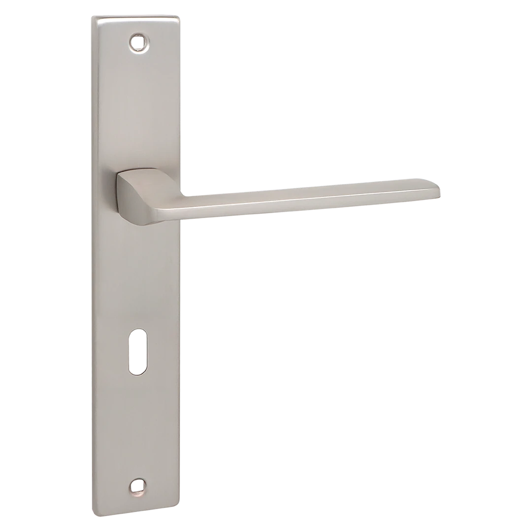 ZAMBIA klamka na szyldzie długim na klucz sprawdzi się w nowoczesnych i klasycznych aranżacjach, gdzie ważna jest trwałość, komfort chwytu oraz spójność z wyglądem skrzydła drzwiowego i okuć.
