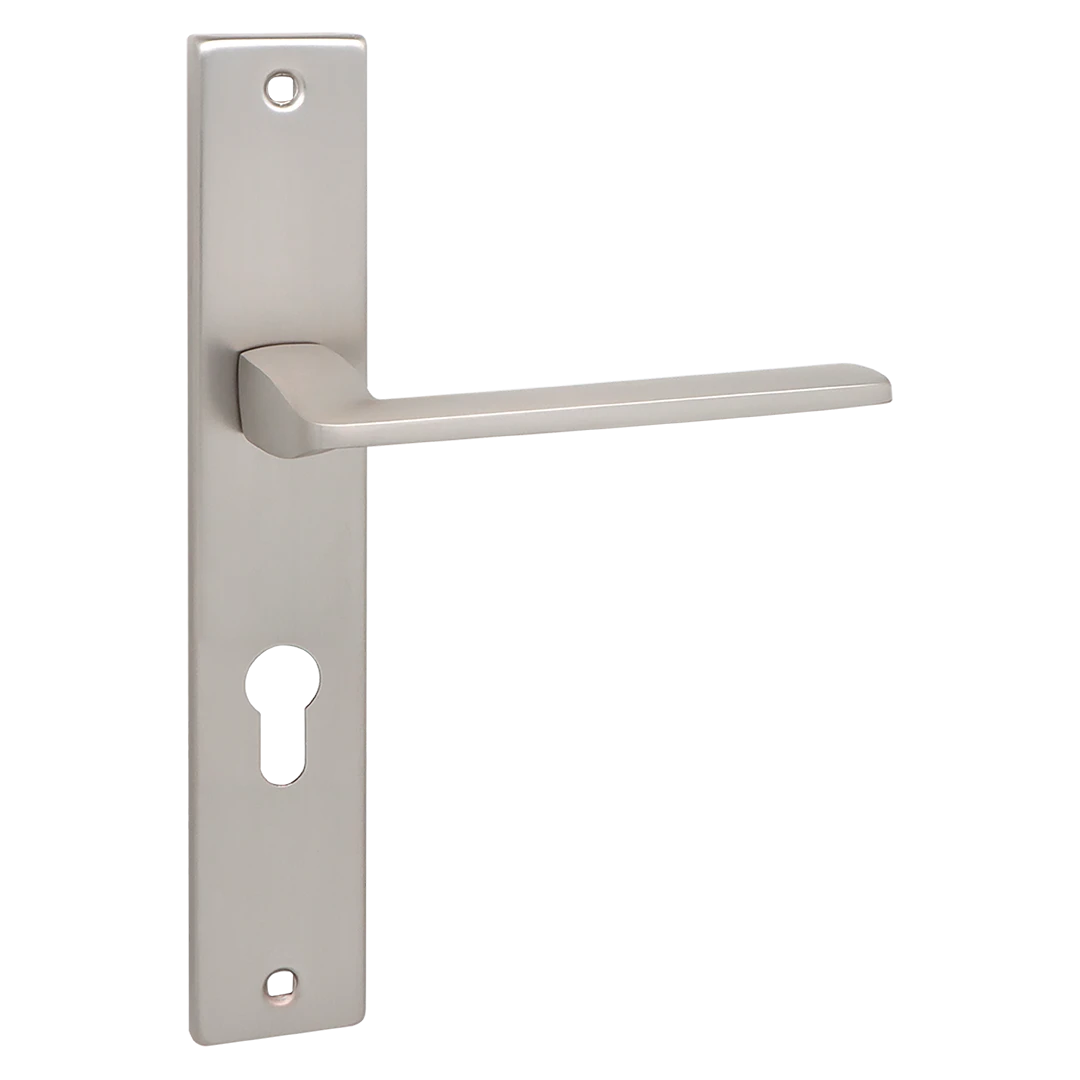 ZAMBIA klamka na szyldzie długim na wkładkę sprawdzi się w nowoczesnych i klasycznych aranżacjach, gdzie ważna jest trwałość, komfort chwytu oraz spójność z wyglądem skrzydła drzwiowego i okuć.